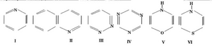 АЗИНДЕР – циклде көмүртек атомдорунан тышкары эң кеминде бир атом азоту бар бирикмелер. Гетероциклинде бир атом азоту бар азиндерге пиридин (I) жана хинолин (II); эки жана андан көп атом азоттууларга диазиндер (III) жана триазиндер (IV) кирет. Ядродо азоттон тышкары башка гетероатомдору бар азиндерге оксазин (V) жана тиазин (VI) таандык: