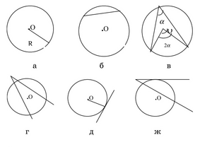 АЙЛАНА – берилген чекиттен (О борборунан) бирдей алыстыкта жаткан тегиздиктеги ийри сызык. Анын О борбору менен кандайдыр чекитин туташтыруучу R кесиндиси айлананын радиусу (а, сүрөт). Айлананын эки чекитин туташтырган кесинди хорда (б, сүрөт), борбору аркылуу өткөн эң узун хорда диаметр деп аталат. Хордага перпендикуляр болгон диаметр аны тең 2ге бөлөт. Жалпы чекитке ээ болуп, эки хордадан пайда болгон бурч ичтен сызылган бурч. Чокусу айлананын борборунда жаткан бурч борбордук бурч (в, сүрөт). Ичтен сызылган бурч жаанын жарымы менен өлчөнөт жана ошол эле жааны камтыган борбордук бурчтун жарымына барабар (в, сүрөт). Кесүүчү эки түз сызык аркылуу пайда болгон бурч анын эки жагы аркылуу чектелген жаанын жарым айырмасы аркылуу өлчөнөт (г, сүрөт). Айланадагы чекит аркы-