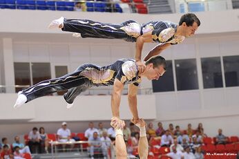 АКРОБАТИКА (грекче akrobates – бутумдун учу менен басам, бийикке чыгам) – 1) гимнастика тибиндеги спорттук машыгуулар; 2) машыгуулардын көп сандаган топторунан (Акробатикалык секирүүлөр, аял‑эркектин же эки эркектин, 3‑4 эркектен турган топтун машыгуулары, эркек менен аялдын батутта секирүулөру) турган спорт түрү. Акробатика өнөрү Байыркы Египет, Грекия, Рим, Византия, Кытай, Японияда белгилүү болгон. Орто кылымда акробатиканын кээ бир элементтерин дарчылар, скоморохтор (Россияда), мимдер (Италияда), жонглёрлор (Францияда) аткарышкан. XVII кылымдын аягынан акробатика циркте кенен тарала баштаган. Акробатика күч көрсөтүү, жерде секирүү, ийинде ойноо, икарийлик оюндар, ат үстүндө ойноо болуп бөлүнөт. Анын айрым элементтери цирктин бардык жанрында, хореография өнөрү менен театр оюндарында да кеӊири колдонулат.