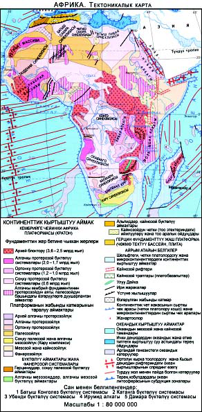 Геологиялык түзүлүшү боюнча Африка ‒ негизинен кембрийге чейинки платформа. Анын фундаменти Нубия-Араб, Ахаггар, Регибат ж. б. калкандарда жер бетине чыгып жатат. Африканын түндүк-батышындагы Атлас тоолорунун ички бөлүгү жана материктик түштүгүндөгү Кап тоолору герцин, ал эми Атлас тоолорунун түндүк тармактары альп бүктөлүүлөрүнө таандык. Дүйнөлүк маанидеги кен байлыктары: алмаз (Түштүк жана Батыш Африка), алтын, уран (Түштүк Африка), темир, алюминий (Батыш Африка), жез, кобальт, бериллий, литий (негизинен Түштүк Африка) рудалары, фосфорит, нефть, табигый газ (Түндүк жана Батыш Африка).