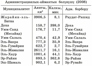 Аянты 11,52 миң км2. Калкы 3,1 млн (2024). Борбору – Доха. Расмий тили – араб тили. Акча бирдиги – катар риалы. Административдик-аймактык жактан 10 муниципалитетке (баладийятка) бө­лүнөт.