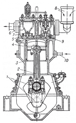 лык кыймылдаткычта колдонулат. Жөнөкөй компрессор алдыга-артка кыймылдоочу поршендүү цилиндрден турат. Капкагында соргуч ж-а толтургуч клапандары жайгашкан. Цилиндрлер улам кийинки баскычтарга биригет ж-а алардын ар биринин кысуу деңгээли 7:1ге чейин. Кыскан маалда газ ысый баштайт да, муздатуучу систе-