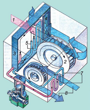 абаны айланышына жараша белгилүү температурада ж-а нымдуулукта жөнгө салып туруучу түзүлмө. Кондиционер автономдуу (муздаткыч машинасы ж-а аба жылыткычы бар) ж-а автономдуу эмес (жылуулукту ж-а муздактыкты сырттан, ал эми абаны борбордук кондиционерден алган) болуп айырмаланат. Бул система өзүнө муздаткыч,