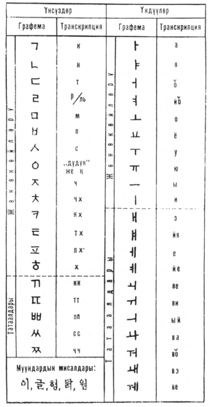 жазылат. Кийинчерээк горизонталь багытта солдон оңго карай жазуу ыгы көп колдонула баштаган. 1949-жылдан КЭДРде К. ж. гана, Түш. Кореяда корей-кытай жазуусу колдонулат. Азыркы корей алфавитинде 40 графема бар. Орфографиясы негизинен морфол. принципте түзүлгөн.