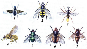 Кош канаттуулар: 1 – көгүш капачы; 2 – гүл дуул­дак чымыны; 3 – төрт чийиндүү чоң баш; 4 – кадим­ки кыкчы чымын; 5 – тарпчы-цезарь; 6 – каардуу ежемуха; 7 – карын көгөөнү.