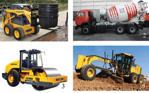 Курулуш машиналары: 1. Мустанг 2044; 2. Бетон аралаштыргыч (КАМАЗ); 3. XGG 121; 4. Deere 872G.