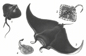 Көөкөрчөктөр: 1- деңиз мышыгы; 2 - деңиз түлкүсү;3 - манта; 4 - электрлүү көөкөрчөк.