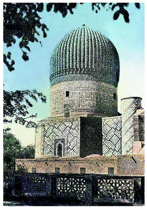 [[File:АРХИТЕКТУРА_59.png | thumb | Самарканд.<br>Гур Эмир мавзолейи, XV кылымдын башы.]]Күмбөздөрдүн (XII кылым) кирпичтери оймо-чиймеленип, көркөм кыналып жана оюу түшүрүлгөн, сары-кызыл чопо <span cat="ж.кыск" oldv="м-н">менен</span> кооздолгон; «ислими» аттуу өтө кооз өсүмдүк ''арабескасы,'' «куфи» <span cat="ж.кыск" oldv="ж-а">жана</span> «насх» жазуулары, өсүмдүктөрдүн, жылдыздардын каршы-терши оймо-чиймелери, чегилген сызыктардын татаал айкалыштары <span cat="ж.кыск" oldv="ж-а">жана</span> кирпичтен кыналган геометриялык оюулар – «гирихтер» кооздугу <span cat="ж.кыск" oldv="ж-а">жана</span> жасалгасынын чебердиги <span cat="ж.кыск" oldv="м-н">менен</span> көз жоосун алат. Кыргызстандын Каракоюн суусунун жээгинде, Ат-Башыдан 80 ''км'' аралыкта Жети-Суу <span cat="ж.кыск" oldv="м-н">менен</span> Кашкарды байланыштырган байыркы кербен жолунда жергиликтүү башкаруучу Мухамед хан | [[File:АРХИТЕКТУРА_59.png | thumb | Самарканд.<br>Гур Эмир мавзолейи, XV кылымдын башы.]]Күмбөздөрдүн (XII кылым) кирпичтери оймо-чиймеленип, көркөм кыналып жана оюу түшүрүлгөн, сары-кызыл чопо <span cat="ж.кыск" oldv="м-н">менен</span> кооздолгон; «ислими» аттуу өтө кооз өсүмдүк ''арабескасы,'' «куфи» <span cat="ж.кыск" oldv="ж-а">жана</span> «насх» жазуулары, өсүмдүктөрдүн, жылдыздардын каршы-терши оймо-чиймелери, чегилген сызыктардын татаал айкалыштары <span cat="ж.кыск" oldv="ж-а">жана</span> кирпичтен кыналган геометриялык оюулар – «гирихтер» кооздугу <span cat="ж.кыск" oldv="ж-а">жана</span> жасалгасынын чебердиги <span cat="ж.кыск" oldv="м-н">менен</span> көз жоосун алат. Кыргызстандын Каракоюн суусунун жээгинде, Ат-Башыдан 80 ''км'' аралыкта Жети-Суу <span cat="ж.кыск" oldv="м-н">менен</span> Кашкарды байланыштырган байыркы кербен жолунда жергиликтүү башкаруучу Мухамед хан | ||