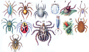 Кенелер: 1 – кампа ке­неси; 2, 3 – чопкуттуу кенелер; 4 – котур ке­неси; 5, 12 – иксод ке­нелери; 6 – чалгычан кене; 7, 8 – тузсуз суу кенелери; 9 – галл ке­неси; 10 – кадимки желе кенеси; 11, 13 –аргас кенелери.