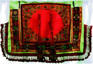 – кооздоп саймаланган, жибек тыштуу ат жабуу. Жибектен тигилип, чети асемделип, кыргагына чачы тагылып, баркыт же ма-