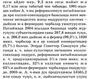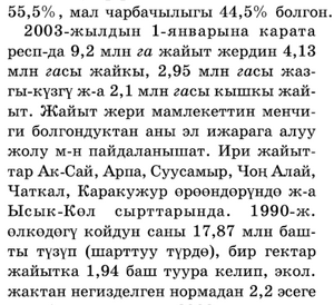 Натыйжада 2004‑жылдын башында чарба жүргүзүүчү субъектилердии саны 267 ,8 миңди түзүп, анын ичинде 266,0 миң дыйкан жана фермер (99,3% ), 1830 мамлекеттик чарбалар жана ар кандай кооперативдер (О, 7о/о) болгон. Эгерде Coвeттеp Союзунун убагында айыл чарба азык‑түлүктөрүн негизинен колхоз-совхоздор өндүрсө, реформанын натыйжасыида айыл чарба продукцияларынын 5%ы гана мамлекеттик жана коллективдик, 32%ы калктын көмөкчү жана 63%ы дыйкан‑фермердик чарбаларда өндүрүлүүдө. 2003‑ж. айыл чарбанын дүң продукциясы 53565,2 млн сомду түзүп, анын ичинде дыйканчылыктын үлүшү 55,5%, мал чарбачылыгы 44,5% болгон. 2003‑жылдын 1‑январына карата республикада 9,2 млн га жайыт жердин 4,13 млн гасы жайкы, 2,95 млн гасы жазгы-күзгү жана 2,1 млн гасы кышкы жайыт. Жайыт жери мамлекеттин менчиги болгондуктан аны эл ижарага алуу жолу менен пайдаланышат. Ири жайыттар Ак‑Сай, Арпа, Суусамыр, Чоң Алай, Чаткал, Кара Кужур өрөөндөрүндө жана Ысык‑Көл сырттарында. 1990‑ж. өлкөдөгү койдун саны 17,87 млн башты түзүп (шарттуу түрдө), бир гектар жайытка 1,94 баш туура келип, экологиялык жактан негизделген нормадан 2,2 эсеге кеп болгон, ал эми 2003‑ж. шарттуу түрдө кой 10,89 млн баш болуп, бир гектар жайытка 1,18 баш туура келген. Бирок, эл жашаган кыштактардын тегерегиндеги жайыттын бир гектарына 2, 74 баш шарттyy кой туура келгендиктен, айлана‑чөйрөгө терс таасир тийгизбей, жайытты ырааттуу пайдалануу учурдун маанилүү маселеси. Республикада 2003‑ж. 1,094 млн га бардык айдоо жердин өсүмдүктөрү (миң га) 619,0 (56,5% ); техникалык өсүмдүктөр – 147,2 (13,5% ); картошка жана жашылча‑бакча өсүмдүктөр – 124,1