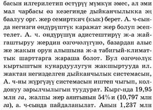 Айыл чарба өндүрүшүн адистештирүү жана жайгаштыруу жердин өзгөчөлүгүнө базардан алыс же жакын орун алышына жана табигый-климаттык шарттарга жараша болот. Бул өзгөчөлүк кыртыштын кунардуулугун жакшыртууда илиммий жактан негизделген дыйканчылык системасын, айыл чарбаны жүргүзүү системасын иштеп чыгып, колдонуу зарылчылыгын туудурат. Кыргызстанда 19,95 млнга, жалпы жер аянтынын 54 о/ои (10,797 млн za), айыл чарбасында пайдаланылат. Анын 1,237 млн гасы айдоо жер, 9,2 млн гасы жайыт жана 0,17 млн гасы табигый чөп чабынды:. 1991‑жылдан кийин айыл чарбаны реформалоонун натыйжасында ири колхоз‑совхоздордун базасында жеке менчикке негизделген жаңы өндүрүштүк система - дыйкан жана фермердик чарбалар уюштурулган.