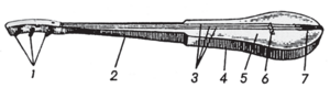 1 – кулактары; 2 – моюну; 3 – кылдары; 4 – чара­сы; 5 – капкагы; 6 – тепкеги (тээк); 7 – куткуну.